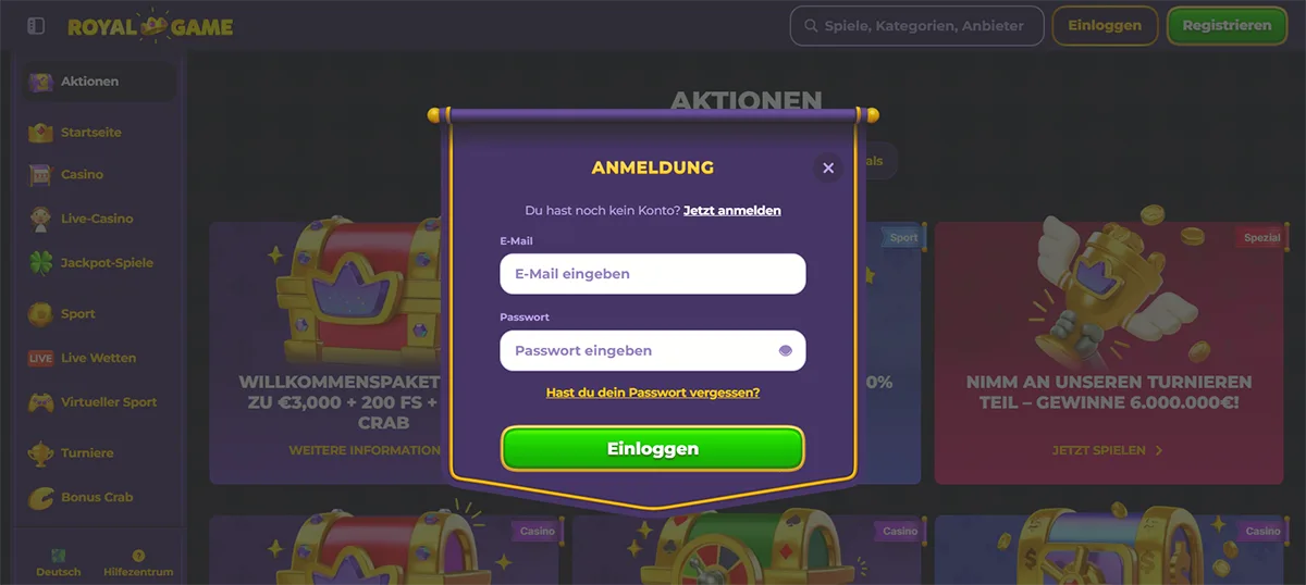 Der Login-Prozess bei Royal Game Casino ist unkompliziert gestaltet und ermöglicht schnellen Zugang zur Spielplattform. Wir können uns mit unserer registrierten E-Mail-Adresse und dem dazugehörigen Passwort anmelden.