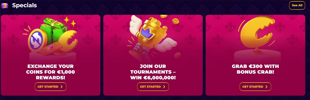 Tournament prizes include cash awards, free play casino credits, and exclusive bonus codes. All tournament winnings carry no additional wagering requirements and remain immediately withdrawable upon completion.